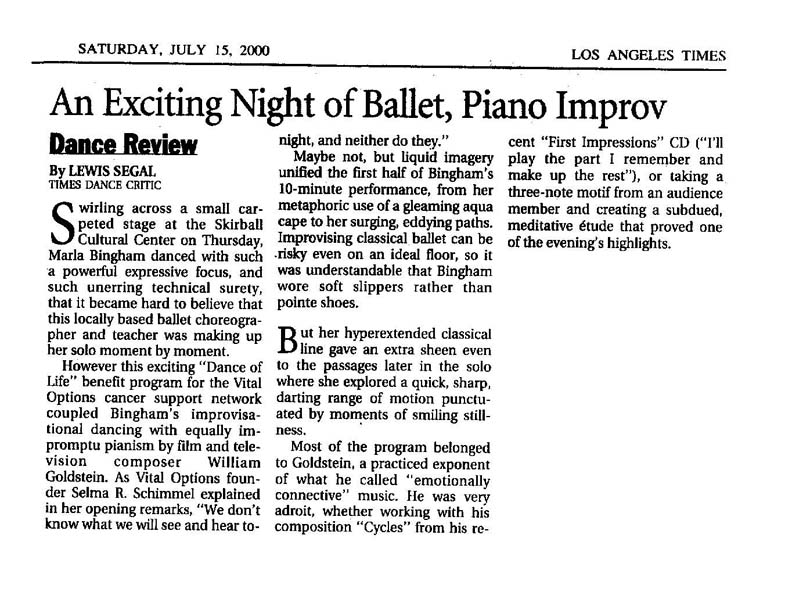 He has been sharing these gifts in his Master Class in Improvisation and The Creative Process. His uniquely gifted improvisations, his arts philosophy (Los Angeles Times), his innovations in technology, his unique approach to solving difficult issues (New York Times), and most of all, his music, continue to inspire. The opportunity to witness the spontaneous burst of creativity apparent in his improvisations, gives music, dance, theater, film and creative writing students; even MBA's, insight into their own creativity, talents and imagination. ( Read the Los Angeles Times review of Goldstein Improvising a Ballet )